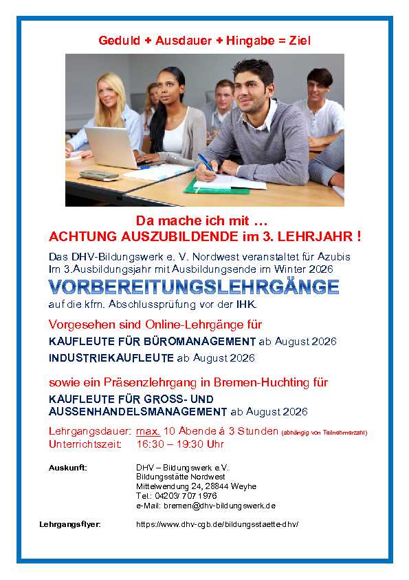 Unsere Geschäftsstellen in Bremenund Münchenbieten Vorbereitungslehrgänge auf die Prüfungen in den kaufmännischen und verwaltenden Berufen an.